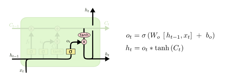 - 시그모이드 레이어에 $x_{t}$와 $h_{t-1}$이 들어가 0~1사이의 값을 출력하고, 이 값은 cell state의 어느 부분을 output으로 내보낼 지 결정함. 이후 cell state가 tanh에 들어가 나온 출력값과 output gate에서 나온 값이 곱해져 $h_t$가 출력됨. 이 $h_t$는 출력값으로 나가가기도 하며, 다음 state의 input으로 들어감.